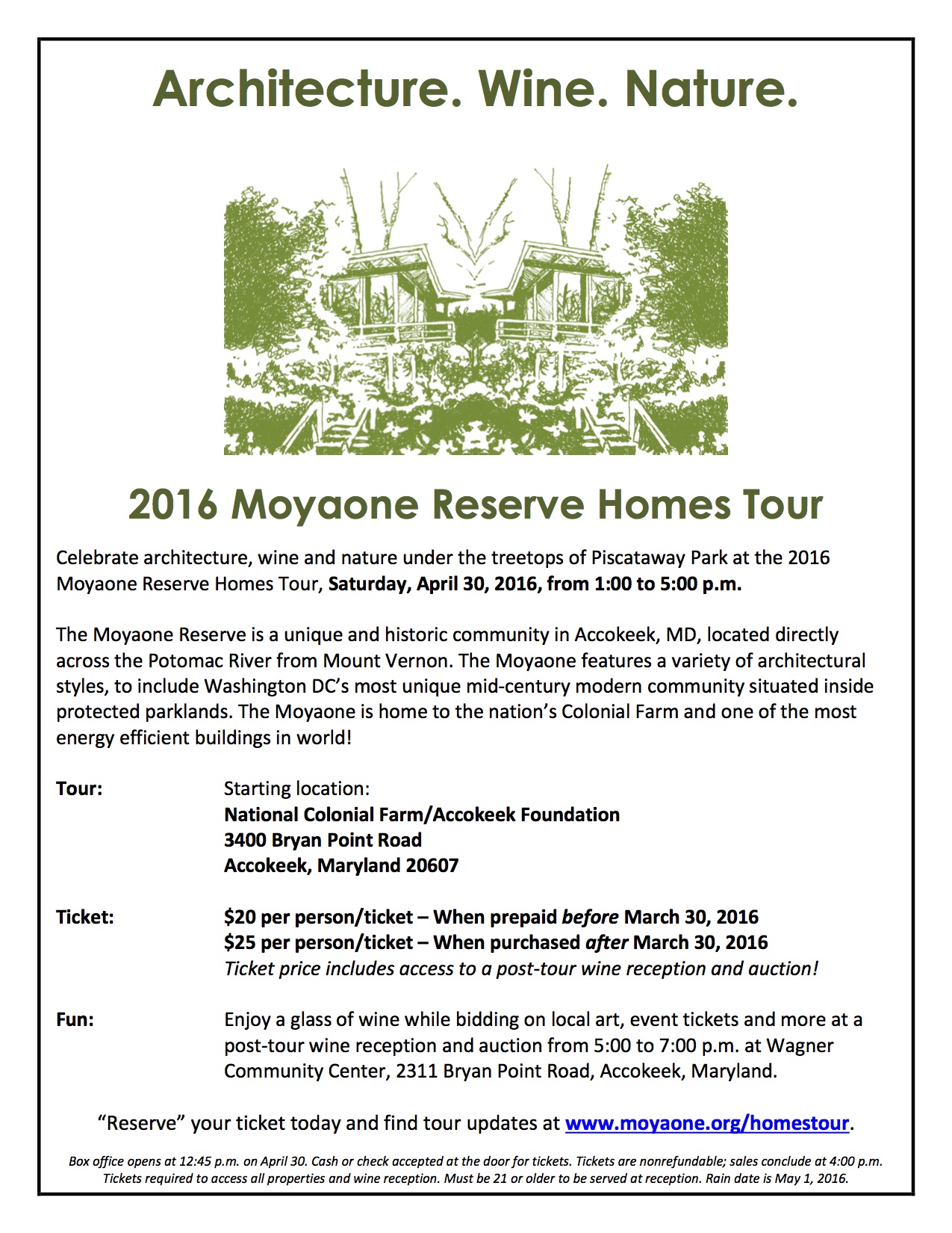Celebrate architecture, wine and nature under the treetops of Piscataway Park at the 2016 Moyaone Reserve Homes Tour, Saturday, April 30, 2016, from 1:00 to 5:00 p.m.